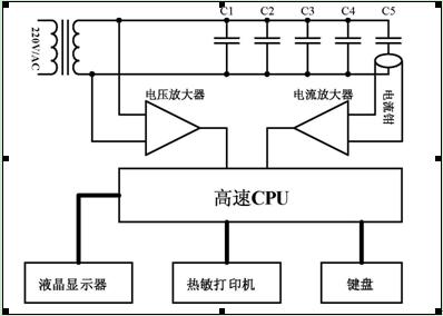變壓器輸出 30V或 2V測試電壓,通過測試線連接到電容組的兩個(gè)匯流排上。匯流排電壓,又經(jīng)過測試線引入到儀器內(nèi)部的電壓檢測電路上。經(jīng)過 A/D轉(zhuǎn)換器變?yōu)閿?shù)字信號后,通過隔離器件,將信號送到 CPU。待測電容 Cx的電流,經(jīng)過鉗型 CT取樣和程控放大后,通過 A/D轉(zhuǎn)換器變?yōu)閿?shù)字信號,送到 CPU。 CPU將收到的數(shù)字信號進(jìn)行處理,并取得電壓 U和電容電流 Ic ,然后按:Cx=Ic/ωU計(jì)算電容量,ω=2πf,f為頻率。